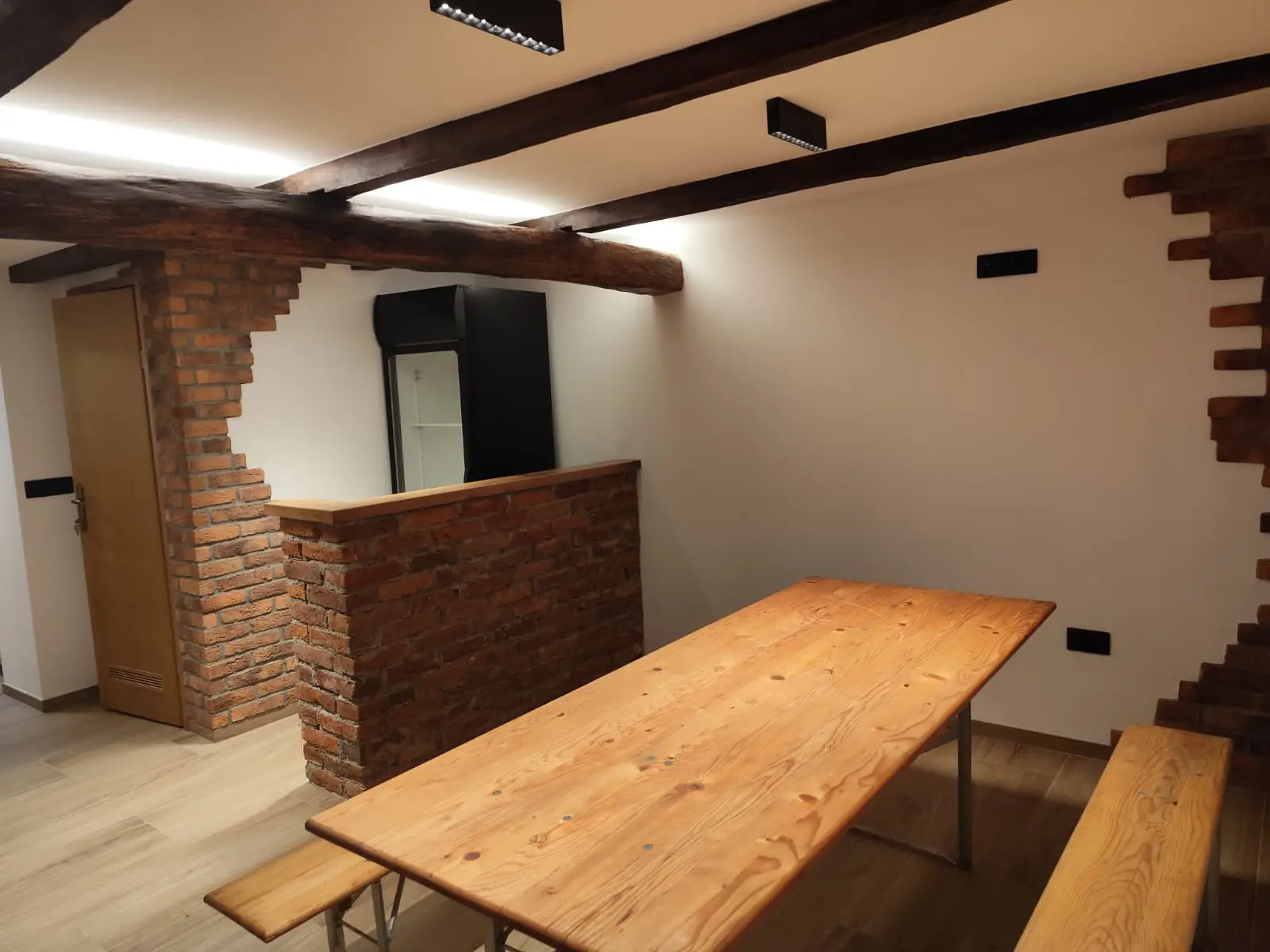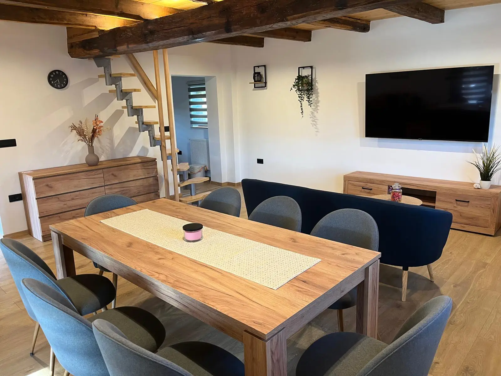 Udoban podrum idealan za druženje do 8 osoba, opremljen mini kuhinjom, WC‑om i hladnjakom za pića — savršeno mjesto za večernja okupljanja i opuštenu atmosferu.